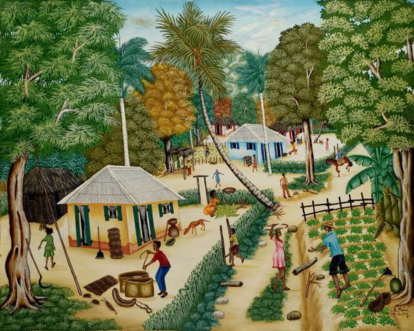 Homme sur la terrasse de sa case, huile sur toile, signée, 50x40...