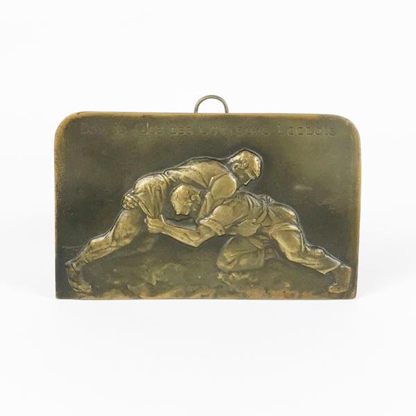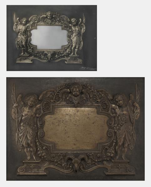 Médaillon à décor d'angelots, tôle repoussée, signé et daté 1899...