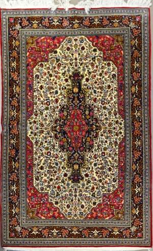 Laine à motif central sur fond rouge et vert, 110x154 cm