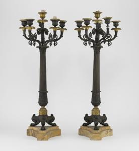 4215. Paire d'importants candélabres à 6 lumières tripodes de style Em...