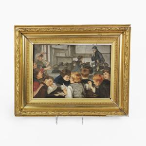 Une leçon de géographie, peinture sur faïence, signée et datée 1...