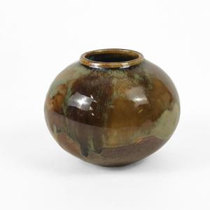 Vase boule sur pied, céramique émaillée noire et marron à décor...