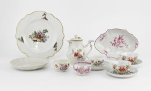 Porcelaine, comprenant: 6 assiettes, 10 tasses, théière, sucrier
