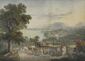 Vue de Neuchâtel de l'Est, aquarelle signée et datée 1817, 45x63...