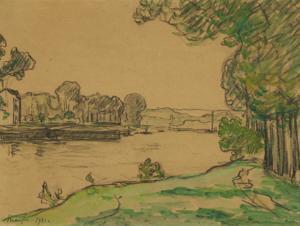 Bord de rivière, fusain et aquarelle sur papier, signé, daté 190...