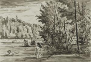 Promenade au bord de la Seine, aquarelle et gouache sur papier,...