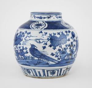 Porcelaine émaillée bleu blanc à décor de jardin, motifs floraux...