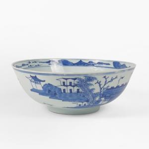 Porcelaine émaillée bleu et blanc à décor d'un paysage animé, D...