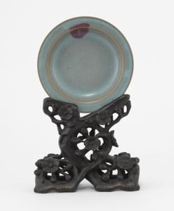 Céramique émaillée bleu taché de pourpre, support en bois sculpt...