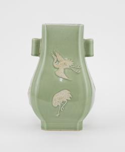 Porcelaine émaillée céladon à décor de hérons en relief, H 33 cm