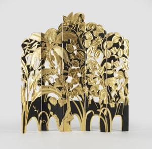 Bois sculpté à motif floral doré sur fond noir, 182x165 cm