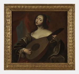 Joueuse de luth, huile sur toile, 78x86 cm. Cadre en bois sculpt...