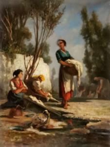 Passage du gué, huile sur panneau, signée Peyron, 39,5x52 cm