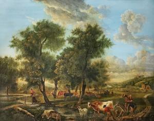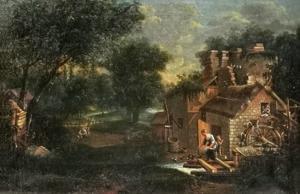 Scène pastorale devant des ruines de château, huile sur toile, 3...