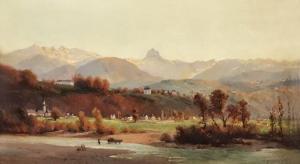 Vue du village de Crans depuis Céligny, huile sur toile, signée,...