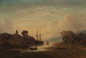 Scène de port, huile sur panneau, attribuée au dos, 44,5x54x5 cm...