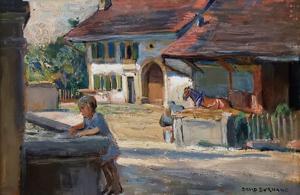 Jeune fille à la fontaine devant une ferme, huile sur carton, 23...