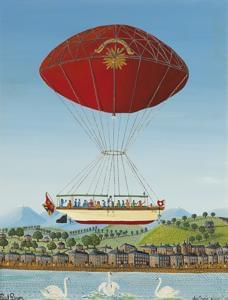 Montgolfière au-dessus de Genève, huile sur toile, signée, 85x50...