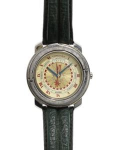 Cadran doré et crème orné d'une rose des vents, aiguilles bleuie...