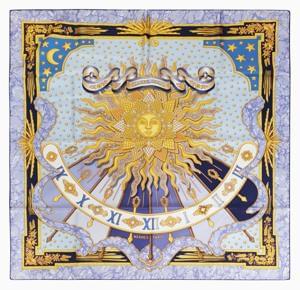 A décor de cadran solaire sur fond doré et bleu, soie, 86x86 cm