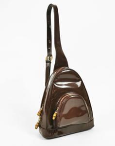Cuir glacé chocolat, garniture dorée et bambou, bandoulière, env...