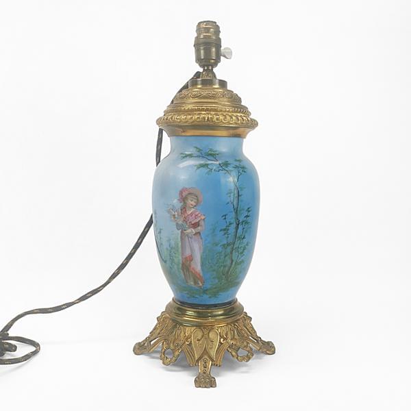 4140. Lampe à décor d'une jeune fille tenant un bouquet de fleurs