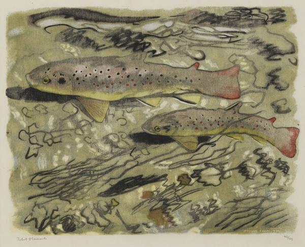 Truites frayant, Moulin Fabri, 7 dec 1949, bois gravé, signé et...