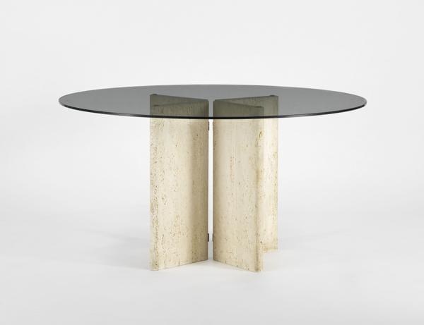 Verre, pierre et teck et garniture en tissu écru, D 135 cm. Prov...