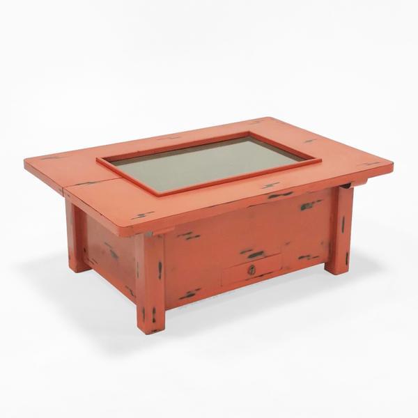 Bois laqué rouge, verre, 30x79x54 cm. Provenance : collection Ma...