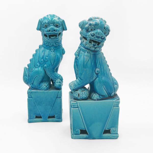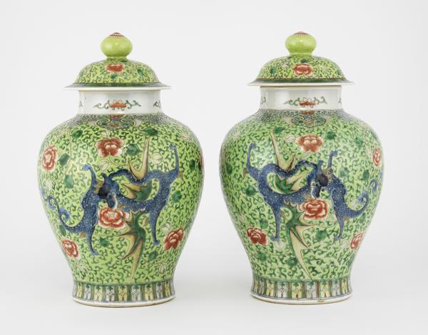 Porcelaine émaillée turquoise, H 31 cm. On joint un deuxième end...