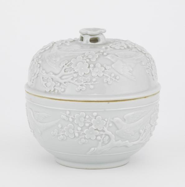 Porcelaine émaillée blanc et pour l'une: céladon à motif en lége...