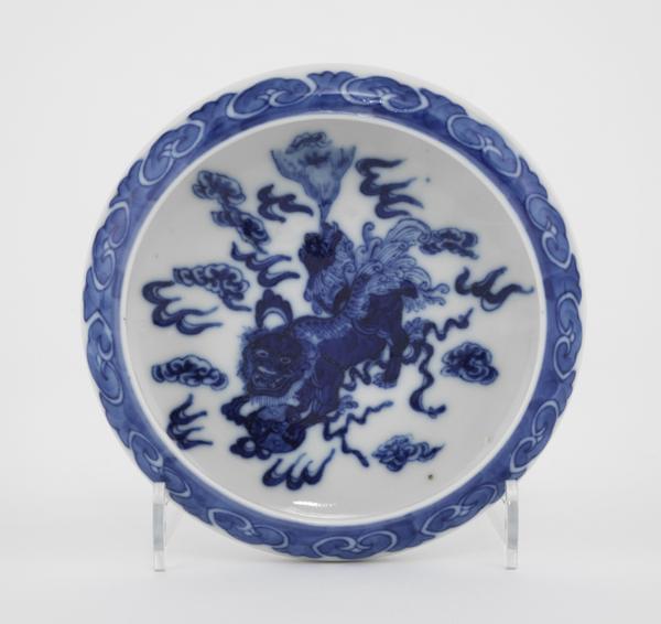 Porcelaine émaillée bleu blanc à motif d'un chien de Fô, D 12 cm