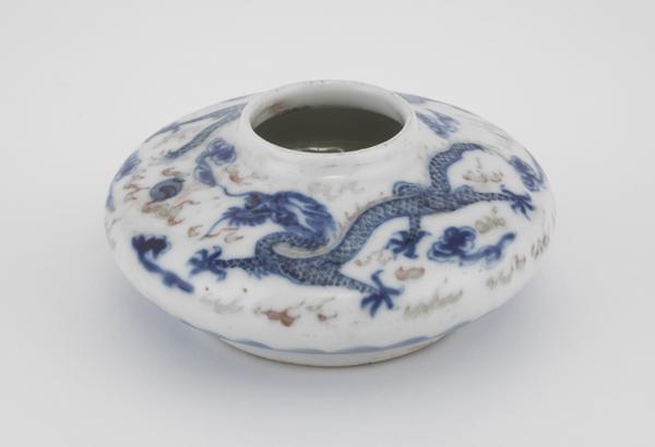 Porcelaine émaillée bleu blanc à décor de dragons et poissons, D...