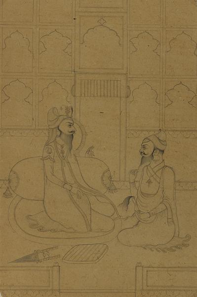 Deux personnages agenouillés dans un intérieur, plume sur papier...