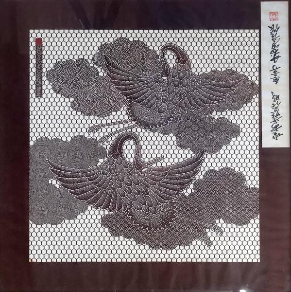 5338. Katagami encadré représentant 2 oiseaux grues "tsuru" par Nakamu...