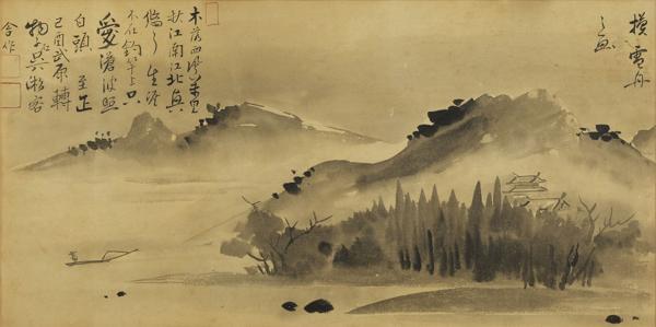 Paysage, encre de Chine, accompagné d'un poème, 29x59 cm