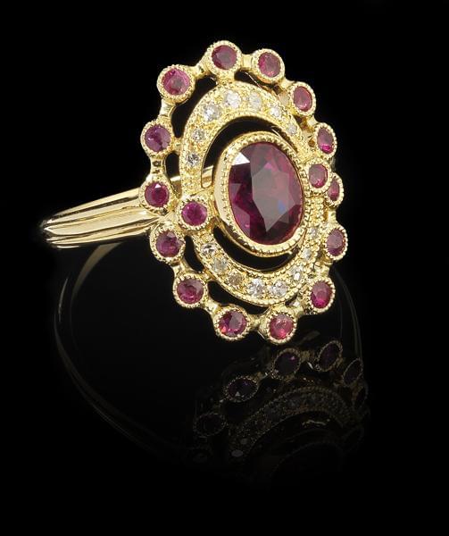 Dans une monture ajourée et entouré de diamants et de rubis, or...