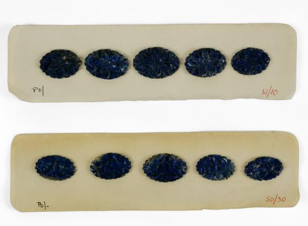 3400. Lot de dix pièces de lapis-lazuli sculptées à motif floral