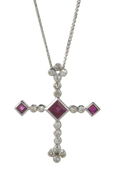3475. Chaîne retenant une croix sertie de rubis et de diamants taille...