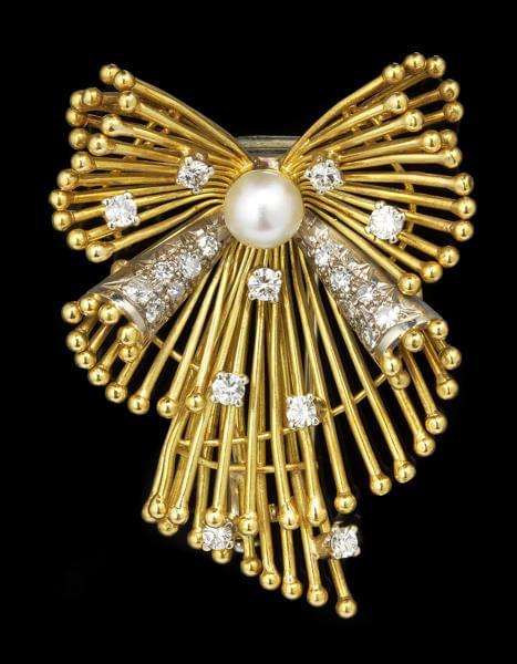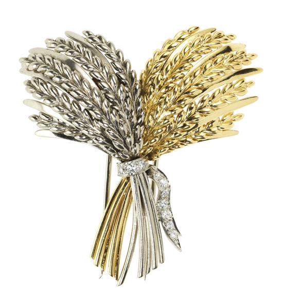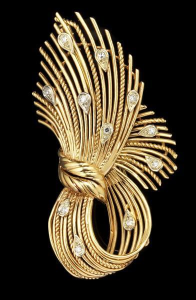 3480. Broche à motif de gerbe stylisée ponctuée de diamants taille 8/8