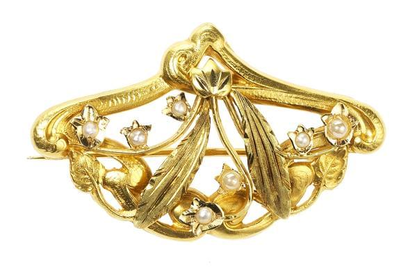 3412. Broche Art nouveau à motif floral sertie de demi-perles