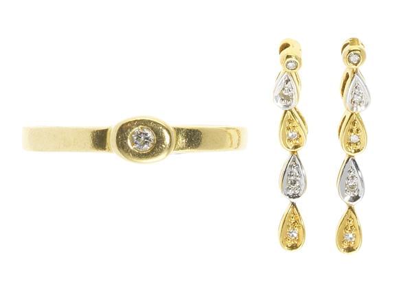Une bague sertie d'un petit diamant et des pendants d'oreilles d...