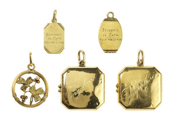 Deux pendentifs porte-photo octogonaux, une médaille Art nouveau...