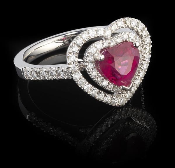 Centrée d'un rubis taille ovale (1,35 ct) dans un double entoura...