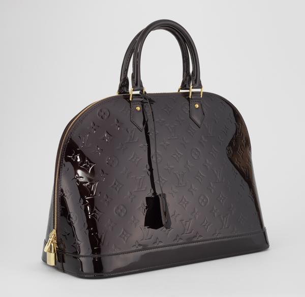 Cuir verni aubergine monogrammé, intérieur en toile marron, ferm...