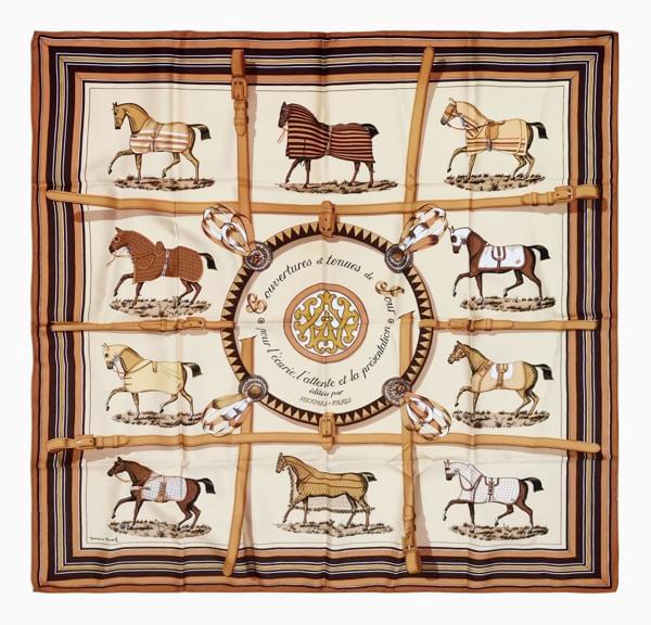 3826. Hermès, lot de deux foulards Couvertures et tenues et Farandole