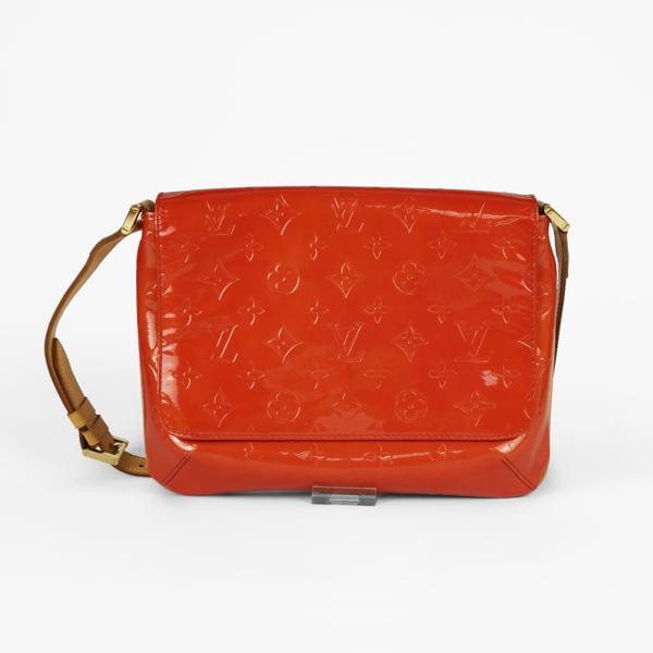 Cuir verni monogrammé vermillon, fermeture en rabats à pression,...