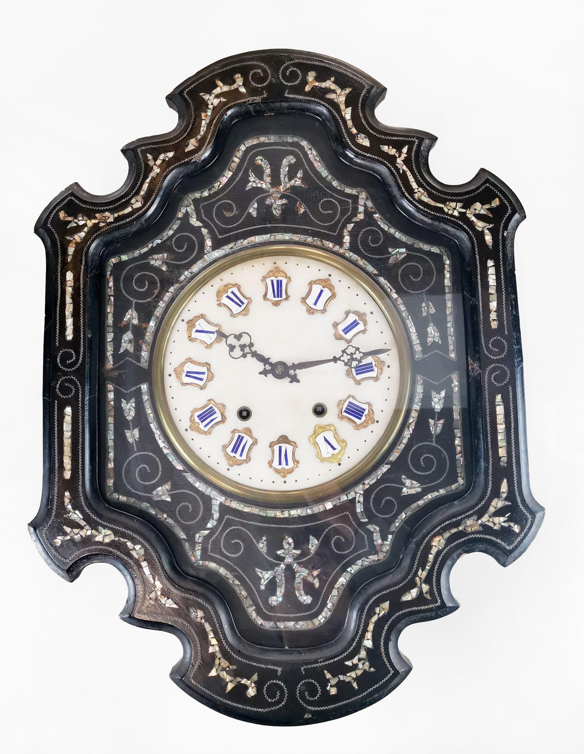 Cadran en marbre, émail et métal doré, caisse en bois noirci incrusté de nacre, H 65x48 cm
