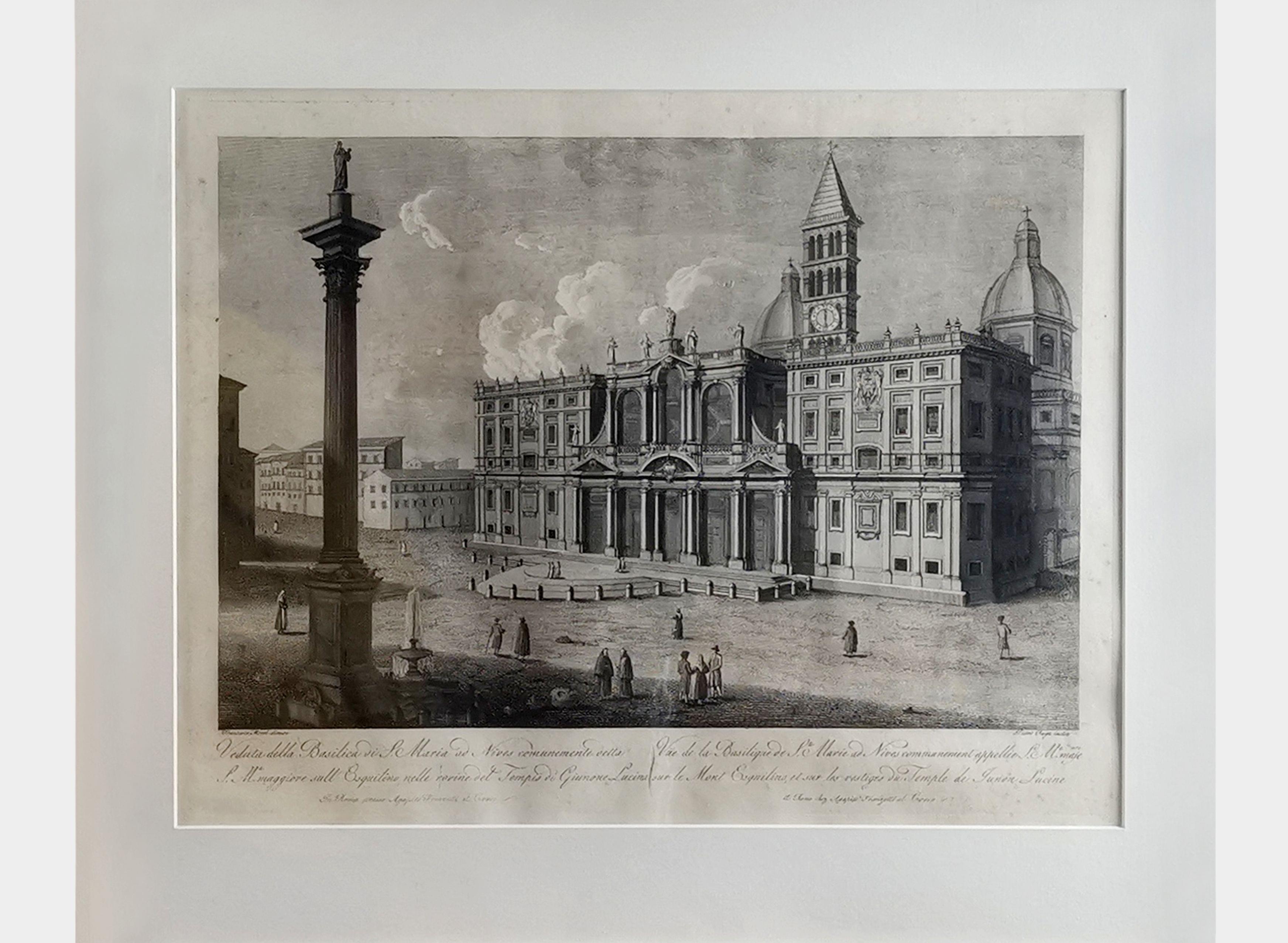 Basiliques et monuments de Rome, suite de huit eaux-fortes, 37x47 cm. Cadres en bois naturel et bois noirci à fleurettes