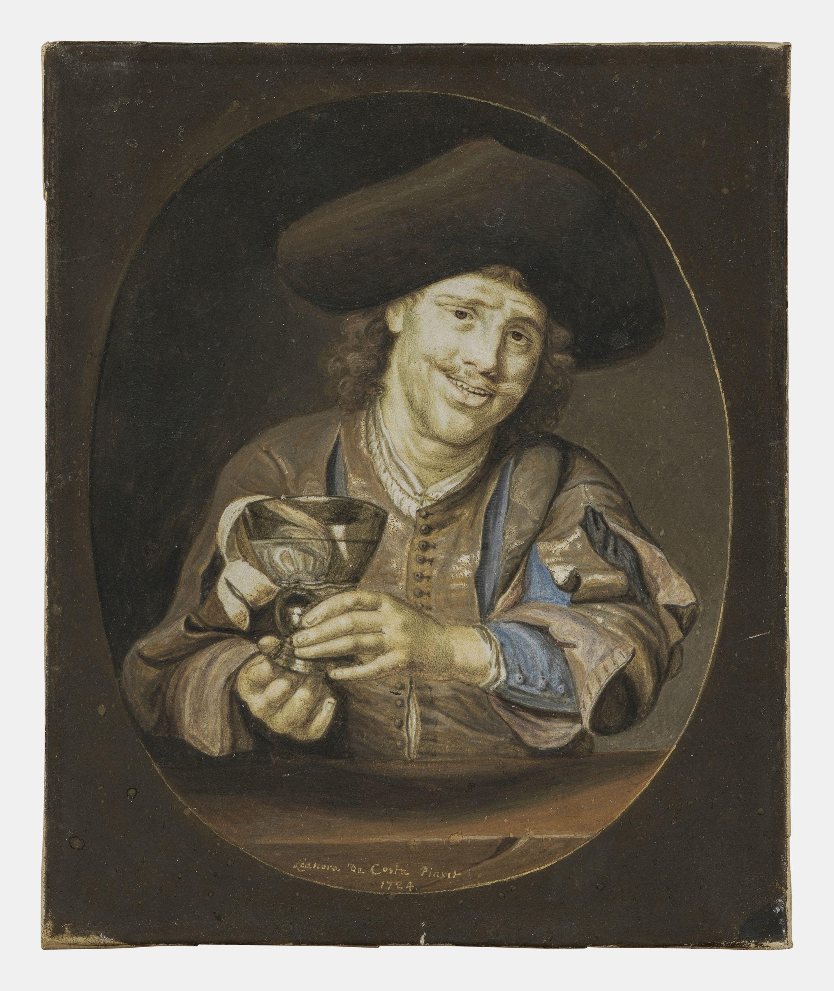 Buveur, gouache sur vélin, signée Leonoro da Costa, datée 1724, 15x13 cm
